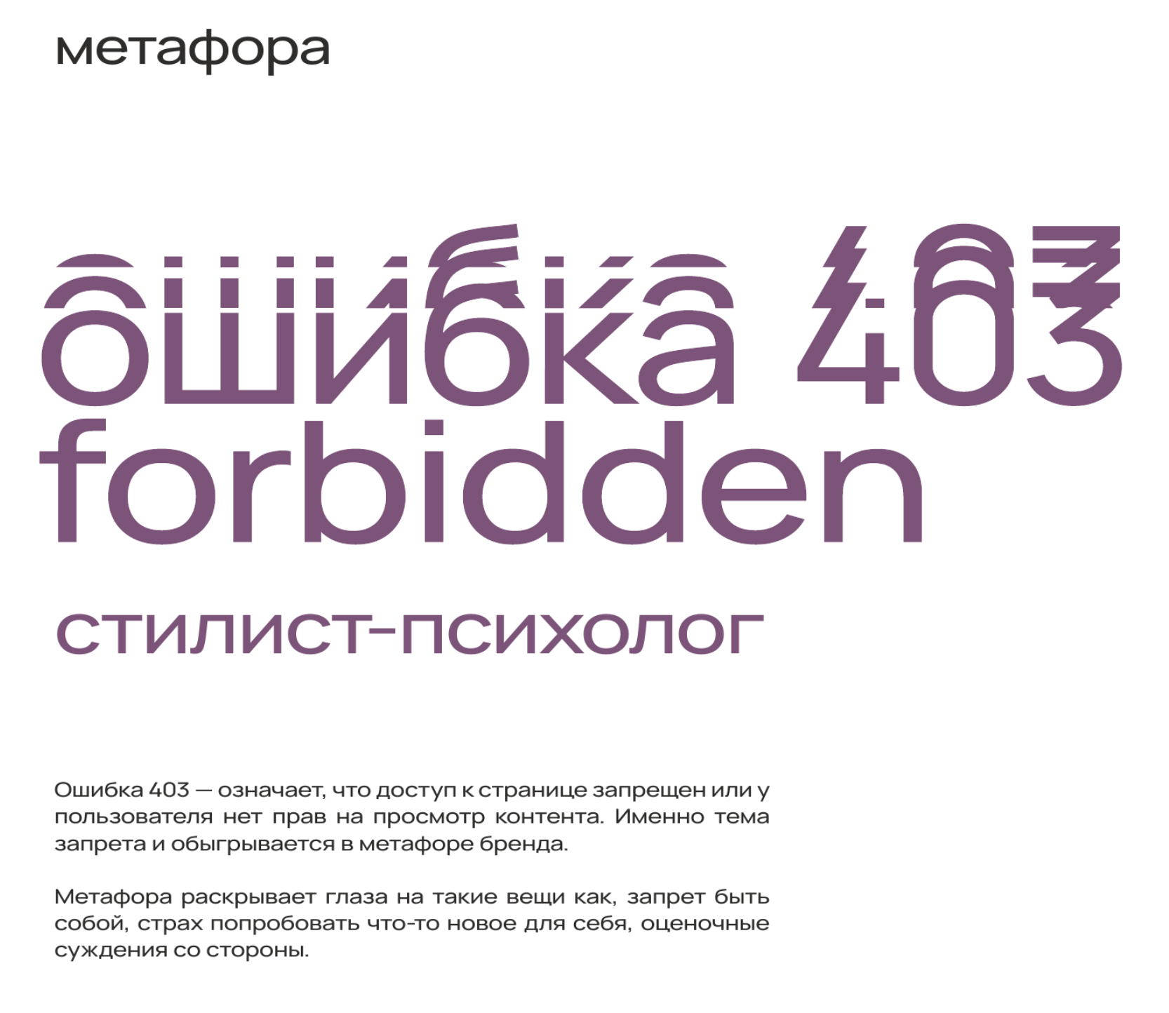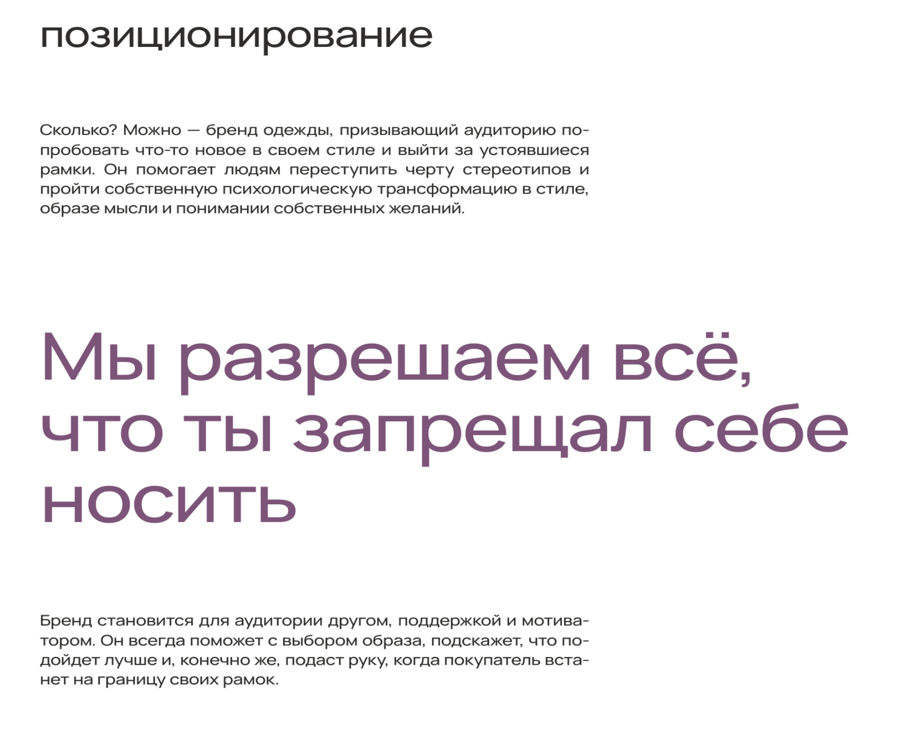Работа над проектов стартовала с аналитики российских брендов одежды со сходным характером. Изначально клиент отметил своих фаворитов на рынке, по которым подобрали успешных игроков. Далее, разработано три креативных концепции, которые были презентованы клиенту. Выбранная концепция стала основой для платформы бренда.